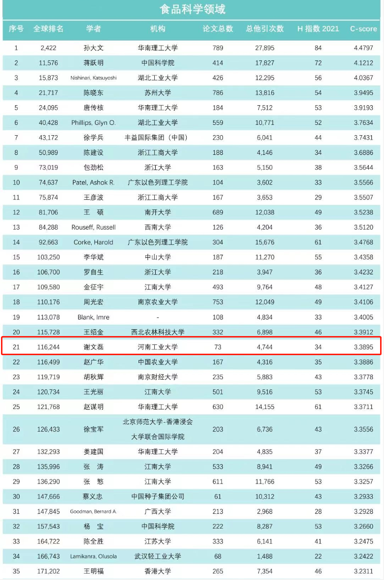 據悉,全球前2%頂尖科學家榜單由斯坦福大學John P. A. Ioannidis教授團隊與Elsevier旗下Mendeley Data合作發布,分為“職業生涯影響力排行榜(Career)”和“年度科學影響力排行榜(Singleyr)”兩個榜單,其中“職業生涯影響力排行榜”統計了科學家職業生涯期間的綜合影響力表現,“年度科學影響力排行榜”反映了科學家上一年度的學術影響力。榜單以Scopus數據庫為依據,基于學者研究成果的引用次數、H因子、Hm因子等綜合指標,按照“生涯影響力”和“年度影響力”從全球近700萬名科學家中遴選出世界排名前2%的科學家,涵蓋數學、物理學、材料化學、化學、信息與通信工程、藥學等22個領域和176個子學科。榜單數據提供了一個面向科學家長期科研表現的衡量指標,能夠更客觀、更真實地反映科學家的影響力。入選榜單,意味著該學者在其研究領域具有較高的世界影響力。謝文磊教授系河南省食品科學領域唯一入選“職業生涯影響力排行榜”的專家學者。