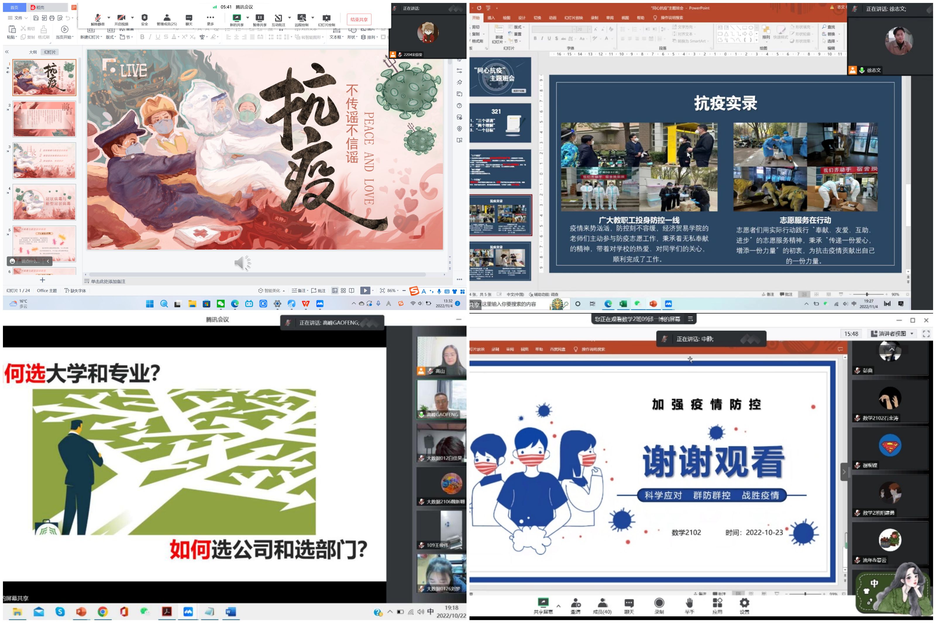 活動開展以來,各學院輔導員、班主任充分發揮主觀能動性,精心組織籌備,依托釘釘會議、騰訊會議、QQ課堂等線上平臺,通過生動講解、PPT演示、視頻播放、師生探討、交流談心等方式,在全校范圍開展了各具特色的“云端班會”。同時,各位老師又結合當前形勢與自身實際,豐富內容形式,把握了班會的“準度”,挖掘了班會的“深度”,提高了班會的“精度”,增加班會的“溫度”。