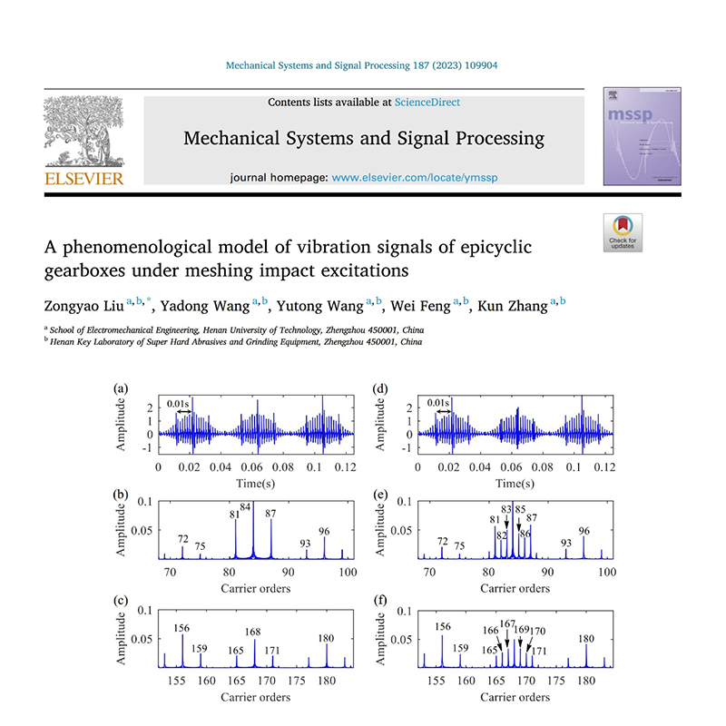 近期,我校機電工程學院青年教師劉宗堯在機械領域國際頂級權威期刊《Mechanical Systems and Signal Processing》(影響因子:8.934,中科院1區TOP期刊)上,以“A phenomenological model of vibration signals of epicyclic gearboxes under meshing impact excitations”為題發表了最新研究成果。劉宗堯為第一作者,碩士研究生王亞東為第二作者,河南工業大學為該論文的第一署名單位和唯一通訊作者單位。