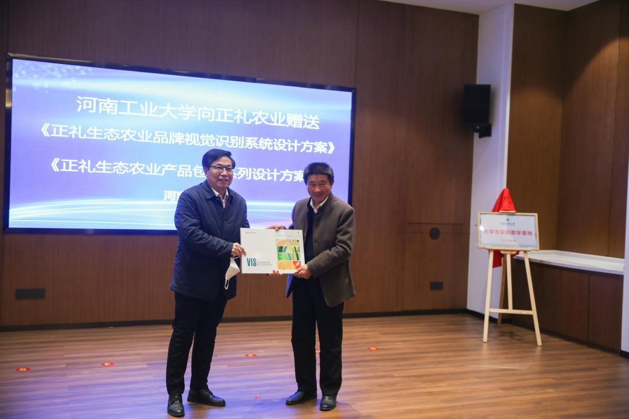 會上,雙方進行了《河南工業大學大學生實踐基地》揭牌儀式,學校向正禮農業贈送了《正禮生態農業品牌視覺識別系統設計方案》《正禮生態農業產品包裝系列設計方案》,進行了《河南工業大學設計賦能磚橋鎮鄉村振興專項協議》簽約儀式。