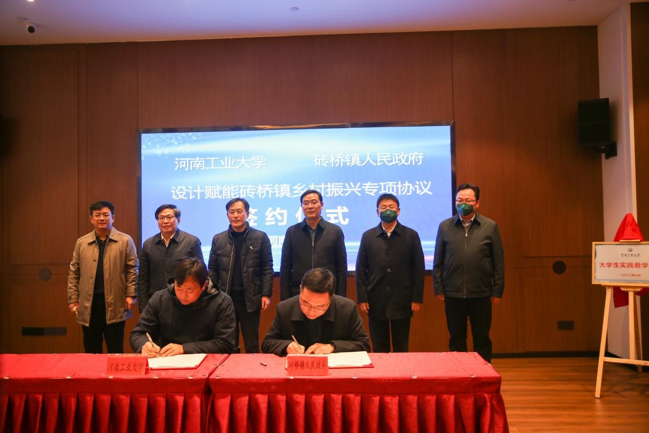 設計藝術學院書記王建輝,光山縣副縣長、磚橋鎮黨委書記張慶楠舉行《河南工業大學設計賦能磚橋鎮鄉村振興專項協議》簽約儀式