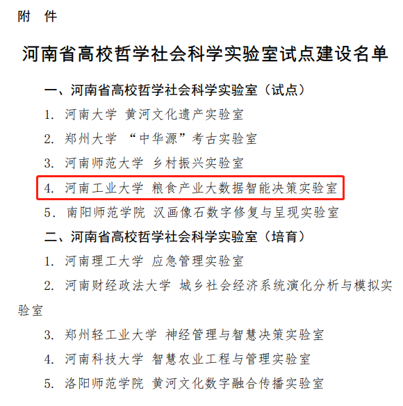 近日,《中共河南省委教育工委河南省教育廳關于公布河南省高校哲學社會科學實驗室試點建設名單的通知》(豫教工委〔2022〕145號)文件正式發布,依托我校經濟貿易學院建設的糧食產業大數據智能決策實驗室獲批河南省首批高校哲學社會科學實驗室。