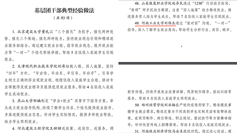 12月16日,團(tuán)中央發(fā)布“基層團(tuán)組織、團(tuán)干部開展幫扶一般院校低收入家庭學(xué)生就業(yè)工作典型經(jīng)驗(yàn)做法”,我校機(jī)電工程學(xué)院兼職團(tuán)干部劉偉杰老師在開展低收入家庭學(xué)生就業(yè)幫扶工作中表現(xiàn)優(yōu)異,總結(jié)提煉出了好的經(jīng)驗(yàn)做法,入選團(tuán)中央促進(jìn)大學(xué)生就業(yè)行動“基層團(tuán)干部典型經(jīng)驗(yàn)做法”,全國共93項(xiàng)。