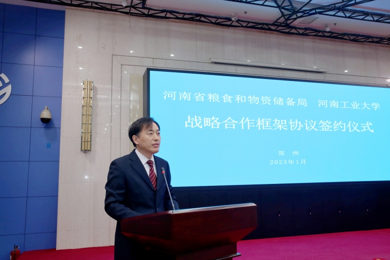 李成偉對(duì)河南省糧食和物資儲(chǔ)備局長(zhǎng)期以來(lái)關(guān)心和支持學(xué)校發(fā)展建設(shè)表示感謝。他表示,此次戰(zhàn)略合作的簽署是堅(jiān)決貫徹落實(shí)習(xí)近平總書(shū)記在黨的二十大報(bào)告中提出“全方位夯實(shí)糧食安全根基”的重要舉措,是局校雙方共同“扛穩(wěn)糧食安全重任,加快推進(jìn)糧食產(chǎn)業(yè)高質(zhì)量發(fā)展”的使命擔(dān)當(dāng),更是堅(jiān)決扛穩(wěn)管好“大國(guó)儲(chǔ)備”和“天下糧倉(cāng)”政治責(zé)任的具體體現(xiàn)。他指出,河南省糧食和物資儲(chǔ)備局作為河南省委貫徹落實(shí)黨中央關(guān)于糧食和物資儲(chǔ)備工作方針政策和決策部署的重要政府機(jī)構(gòu),在構(gòu)建新時(shí)代糧食安全保障體系,保障國(guó)家糧食安全方面發(fā)揮了重要作用,做出了突出貢獻(xiàn)。作為河南省人民政府與國(guó)家糧食和物資儲(chǔ)備局共建高校和河南省“雙一流”創(chuàng)建高校,學(xué)校擁有全國(guó)最完整的糧油食品學(xué)科群,具有雄厚的師資力量和較強(qiáng)的科研實(shí)力。學(xué)校一定會(huì)抓住與省局戰(zhàn)略合作的重要機(jī)遇,充分發(fā)揮學(xué)校在人才、科技和創(chuàng)新等方面優(yōu)勢(shì),支持和推進(jìn)雙方合作內(nèi)容落地見(jiàn)效,開(kāi)花結(jié)果,為河南省糧食和物資儲(chǔ)備事業(yè)高質(zhì)量發(fā)展提供科技支撐,為扛穩(wěn)國(guó)家糧食安全重任做出更大的貢獻(xiàn)。