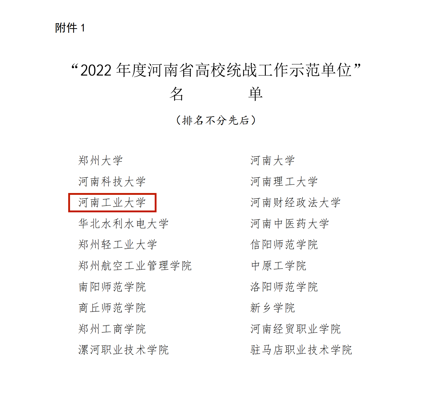 本次示范單位考核分為高校自評、專家組復評等主要環節,主要考核評價全省高校2022年落實中央、省委統戰工作決策部署和日常工作開展情況。自接到考核通知后,我校黨委高度重視,黨委統戰部周密組織,學校統戰工作領導小組成員單位和二級單位黨組織強化落實,圍繞黨委重視情況、組織保障情況、條件保障情況、統戰部門自身建設、統戰工作、加分項目等9大類33項考核指標,對我校2022年度統戰工作進行全面梳理和自查自評,認真準備各項支撐材料,經省委高校工委、省教育廳組織專家復評,各項指標評比均取得優異成績。學校統戰工作受到上級主管單位肯定。“河南省高校統戰工作示范單位”稱號的獲得是對我校統戰站工作的充分肯定和激勵鞭策。