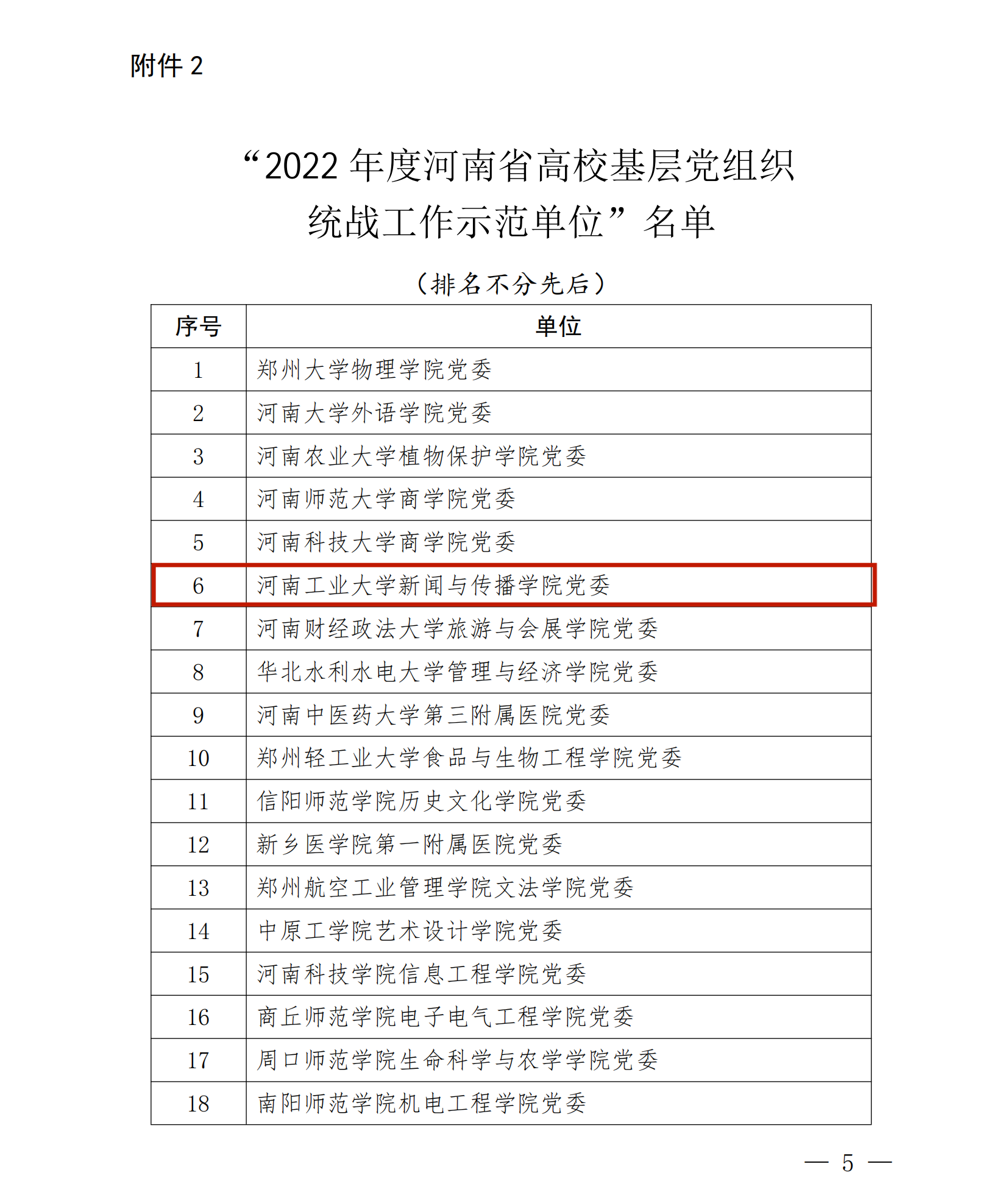 近日,中共河南省委教育工委、河南省教育廳下發了《關于表彰2022年度河南省高校統戰工作示范單位和先進個人的通知》,(豫教工委〔2023〕5號),我校成績突出,被授予“2022年度河南省高校統戰工作示范單位”稱號。新聞與傳播學院黨委被評為“2022年度河南省高校基層黨組織統戰工作示范單位”