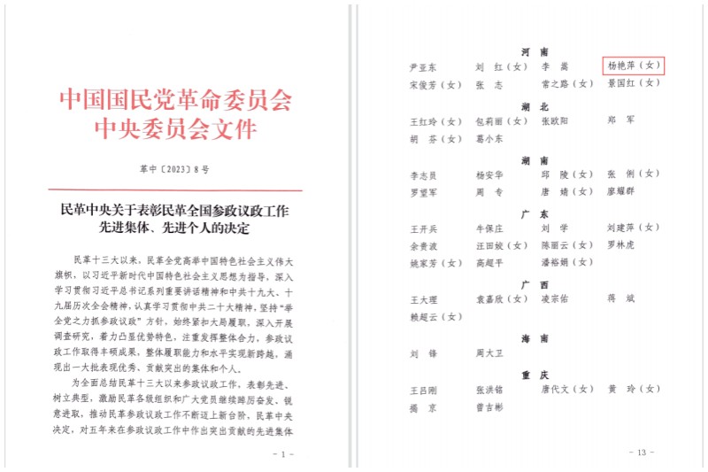 近日,中國國民革命委員會中央委員會下發了《民革中央關于表彰民革全國參政議政先進集體和先進個人的決定》,對五年來全國在參政議政中做出突出貢獻的110個“先進集體”和248位“先進個人”進行了表彰。民革河南省委委員、河南省人大代表,民革河南工業大學基層委員會主委楊艷萍獲此殊榮,是河南高校中的唯一獲得者。