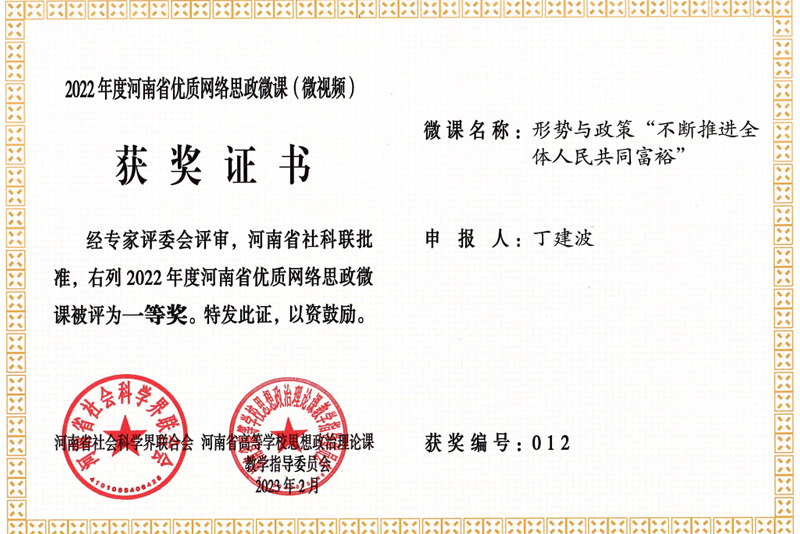 近日,河南省社會科學界聯合會公布了2022年度河南省優質網絡思政微課(微視頻)獲獎名單,我校馬克思主義學院丁建波老師的作品《形勢與政策“不斷推進全體人民共同富裕”》榮獲思政微課一等獎。