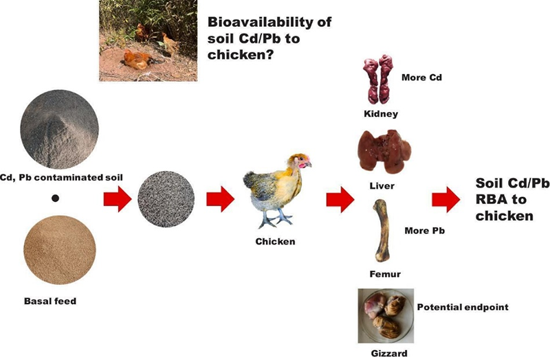環境污染會對食品質量安全和生態環境安全產生影響。散養雞攝食重金屬污染土壤可能會對雞的健康和雞肉的安全品質產生不利影響。然而,這一點目前缺乏研究。該研究的結果表明,雞食用污染土壤后,污染土壤中的鎘和鉛約有50%-70%可被雞吸收;肌胃、雞肝、腎臟等器官中重金屬含量較高。該研究結果的重要性在于,一是獲得了污染土壤中鎘和鉛對雞的生物有效性數據;二是該結果表明,在重金屬污染區,污染土壤中重金屬對鳥類存在較大的健康風險;三是雞散養時,應當考慮散養地土壤重金屬含量,在重金屬污染區,應當禁止散養禽類。