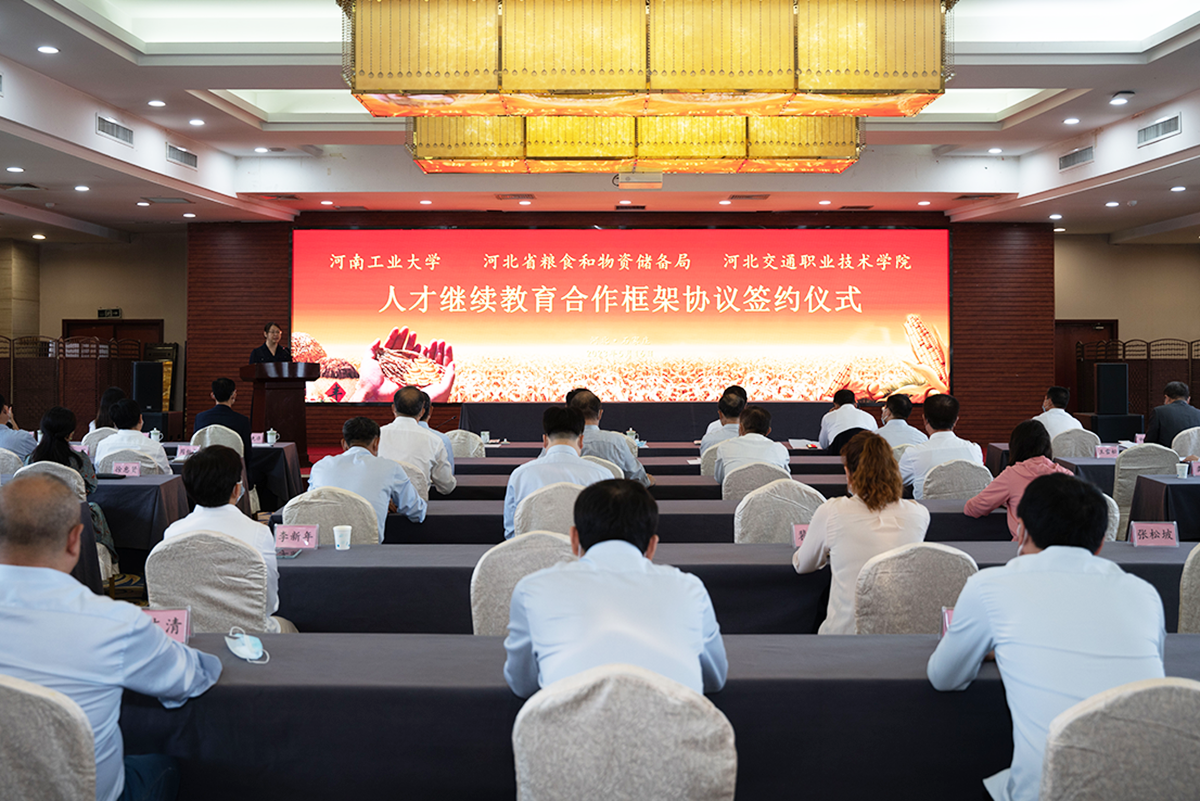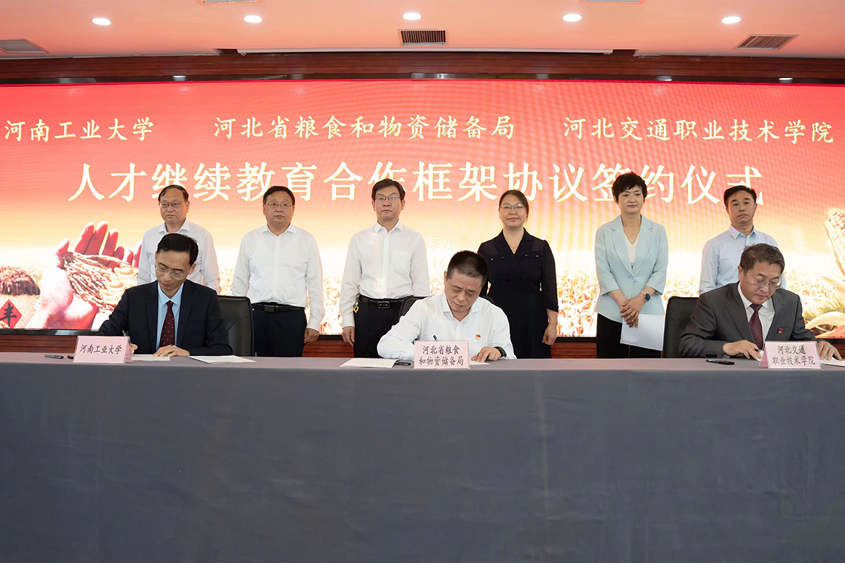 河北省糧食和物資儲備局副局長劉志安、河南工業大學教育培訓學院院長劉克非、河北交通職業技術學院繼續教育中心主任申維新代表局校三方簽訂了人才繼續教育合作框架協議。