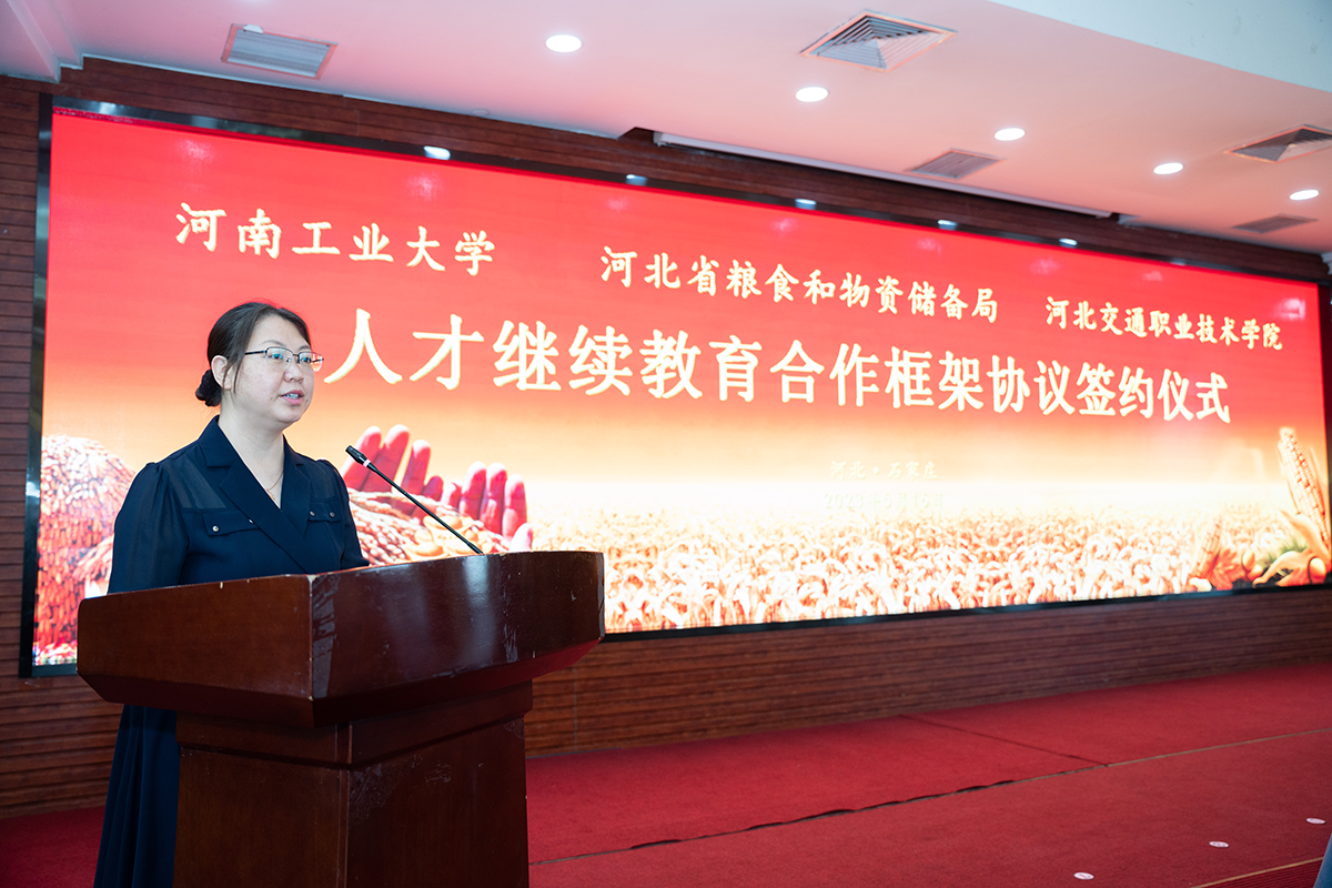 霍彥飛在致辭中指出,今年是全面落實黨的二十大精神開局之年,河北省糧食和物資儲備局、河北交通職業技術學院和河南工業大學簽署人才繼續教育合作框架協議基礎穩固、恰逢其時、前景廣闊、未來可期,有利于促進和引領河北省糧食和物資儲備事業創新人才培育、創新能力提升、創新成果轉化。他強調,要積極推進產教融合、政校合作,共同打造新時代職業教育、高等教育創新發展政校合作新標桿,為糧食和物資儲備事業高質量發展提供科技支撐和人才支撐。