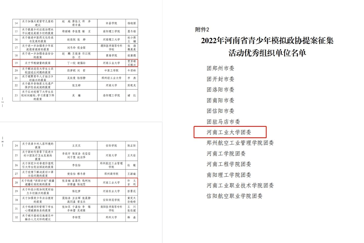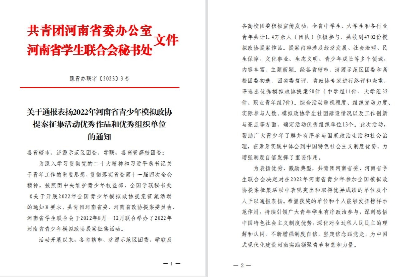 近日,為表揚優(yōu)秀、激勵典型,共青團河南省委、河南省學生聯(lián)合會對在2022年河南省青少年參加全國模擬政協(xié)提案征集活動中表現(xiàn)突出和取得優(yōu)異成績的單位及個人予以通報表揚。我校團委榮獲活動優(yōu)秀組織單位,兩件作品獲評優(yōu)秀,位全省前列。