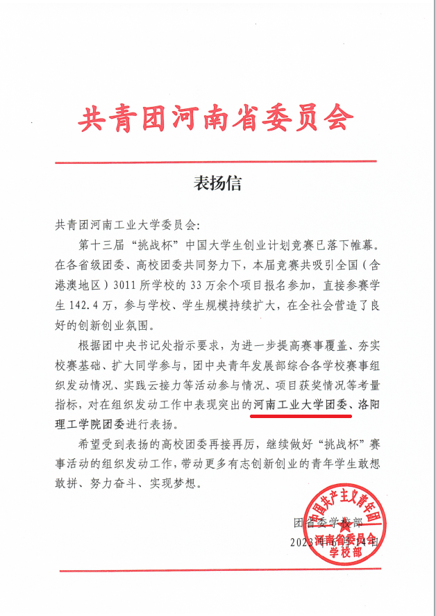 第十三屆“挑戰杯”中國大學生創業計劃競賽已落下帷幕。6月14日,我校收到表揚信。團中央青年發展部對在第十三屆“挑戰杯”競賽組織發動工作中表現突出的學校進行表揚,河南省僅兩所高校。