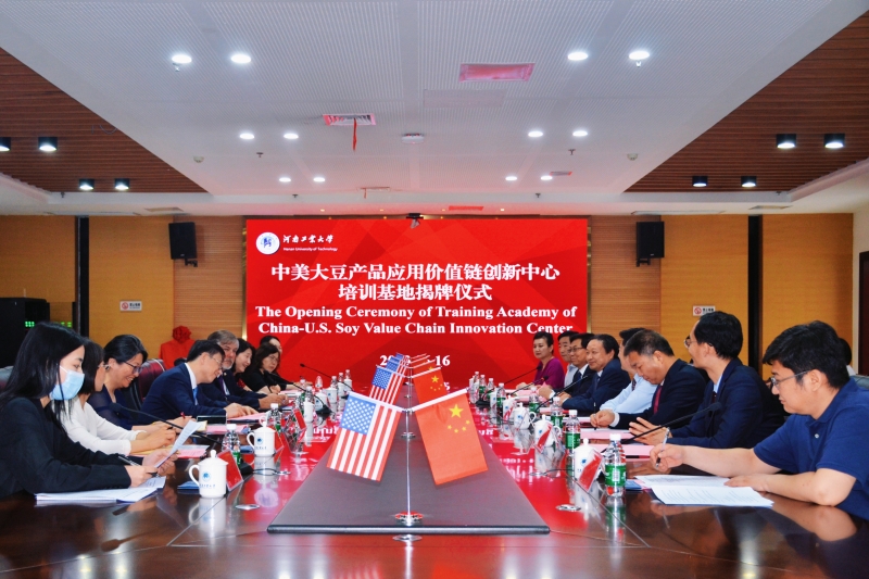 6月16日,“中美大豆產品應用價值鏈創新中心培訓基地”揭牌儀式在我校蓮花街校區舉行,省委外辦副主任、一級巡視員王自文,美國大豆出口協會主席薄思禪(Stan Born),省委外辦美洲大洋洲工作處處長閆景偉,商丘市委外辦主任賈發生,美國大豆出口協會大中華區首席代表張曉平,我校副校長陳復生、副校長李煥鋒、國際交流與合作處、教育培訓學院相關同志參加了揭牌儀式。儀式由李煥鋒主持。