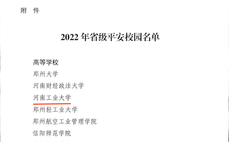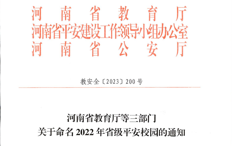 近日,河南省教育廳、省平安建設工作領導小組辦公室、省公安廳聯合發文,授予我校“2022年省級平安校園”榮譽稱號。