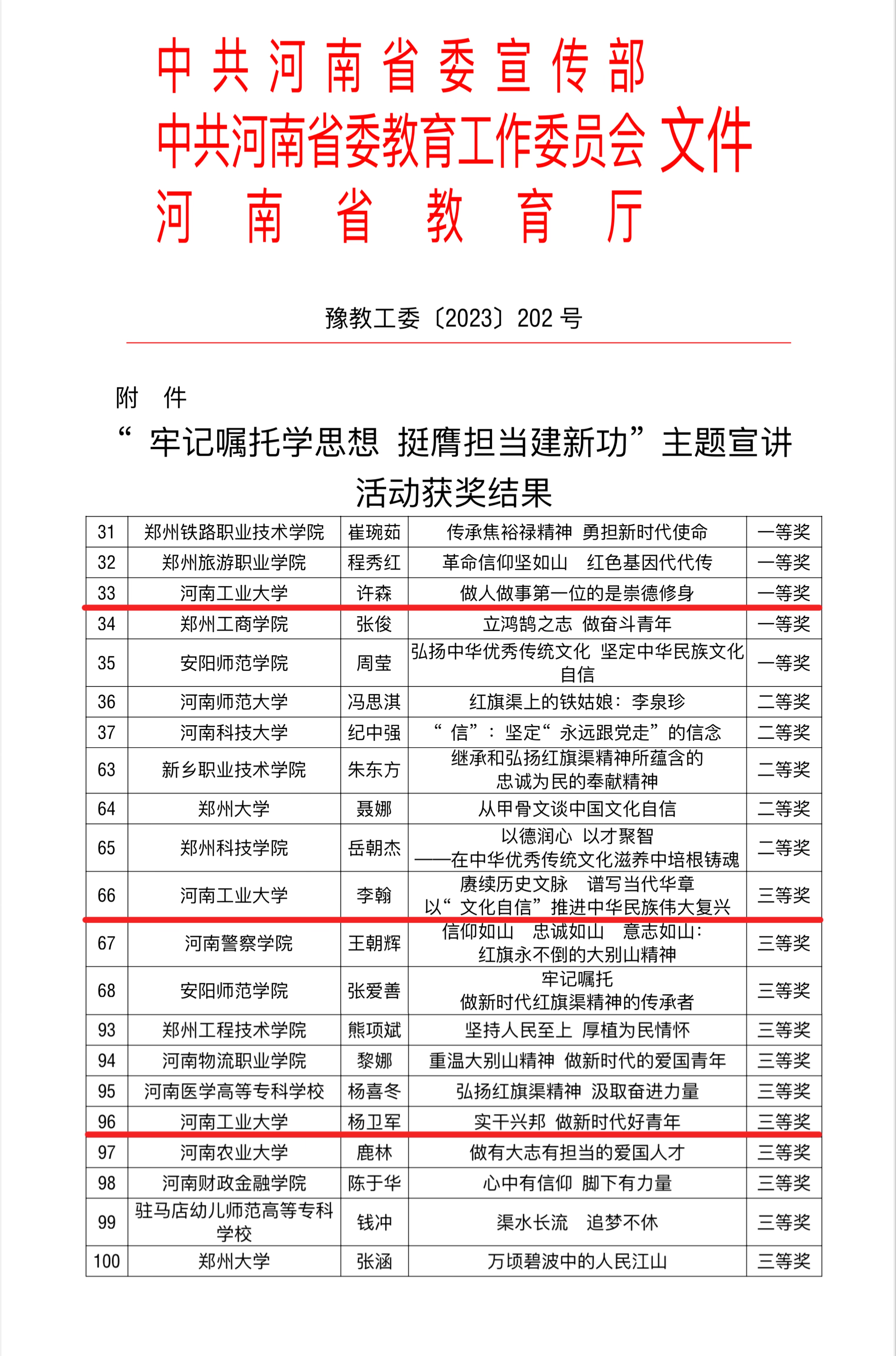 近期,中共河南省委宣傳部 中共河南省委教育工委 河南省教育廳關于“牢記囑托學思想 挺膺擔當建新功”主題宣講活動評選結果揭曉,我校教師許森榮獲一等獎,李翰、楊衛軍榮獲三等獎。