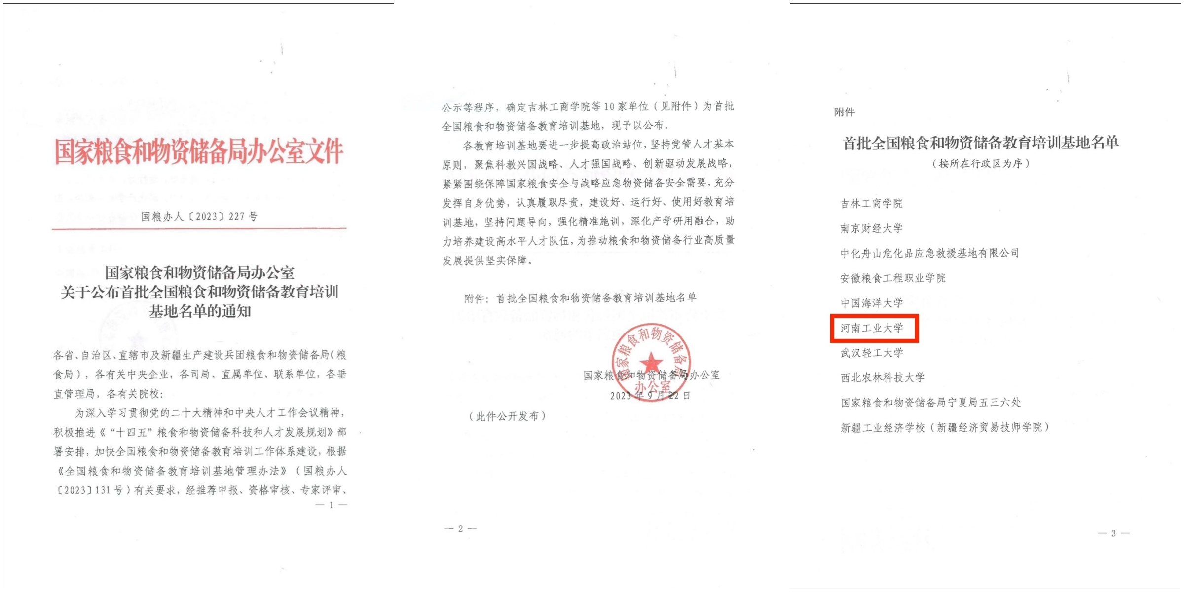 近日,國家糧食和物資儲備局發文《關于公布首批全國糧食和物資儲備教育培訓基地名單的通知》(國糧辦人〔2023〕227號),經推薦申報、資格審核、專家評審、公示等程序,河南工業大學成功入選首批全國糧食和物資儲備教育培訓基地。本次共有十家單位入選首批基地名單,其中我校是省內唯一入選的高校單位。