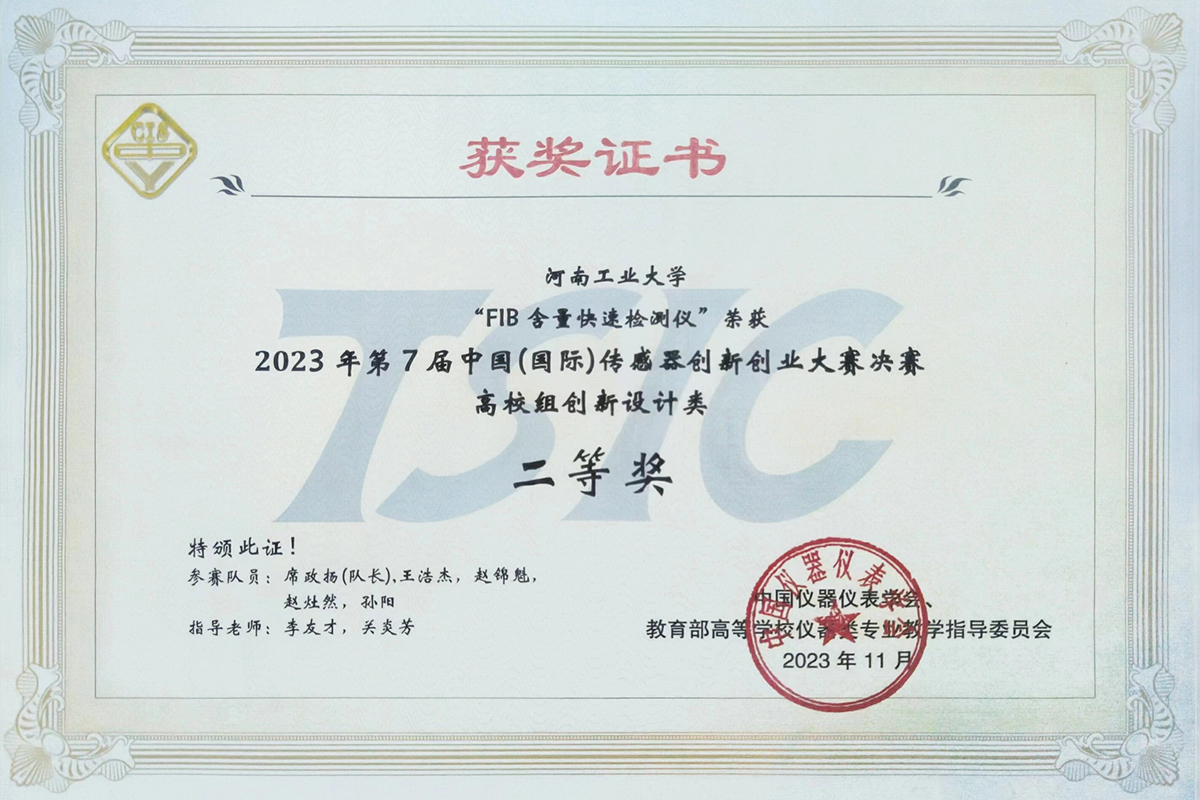 11月6日,作為2023世界傳感器大會分項目的第7屆中國(國際)傳感器創新創業大賽決賽在鄭州國際會展中心落下帷幕。我校機電工程學院機械設計制造及其自動化專業席政揚、王浩杰、趙錦魁、趙灶然和孫陽五名同學組成的“FIB含量快速檢測儀”團隊在關炎芳和李友才兩位導師的帶領下,經過激烈角逐,從全國97個決賽隊伍中脫穎而出,榮獲高校組創新設計類國賽二等獎。