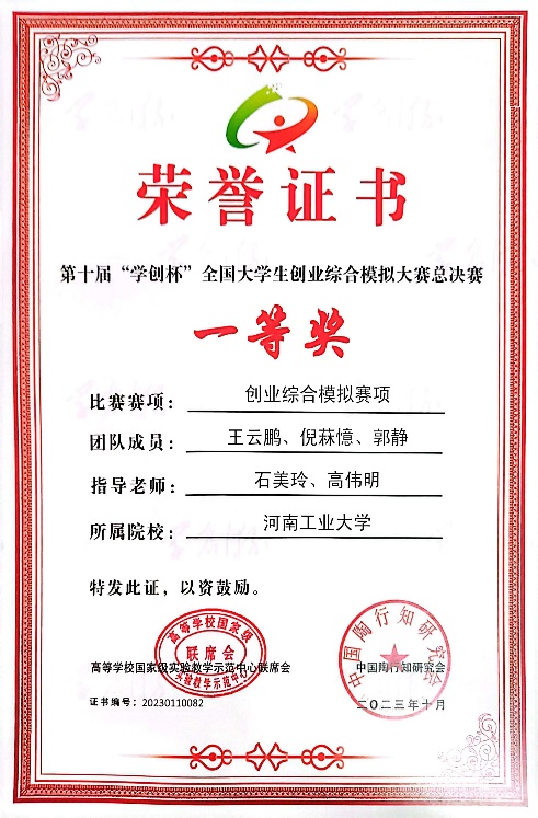 近日,第十屆“學創杯”全國大學生創業綜合模擬大賽全國總決賽在黑龍江大學舉行。經過激勵角逐,由我校管理學院石美玲、高偉明老師指導,學生王云鵬、倪菻憶、郭靜組成的“智慧隊”團隊喜獲全國總決賽一等獎。