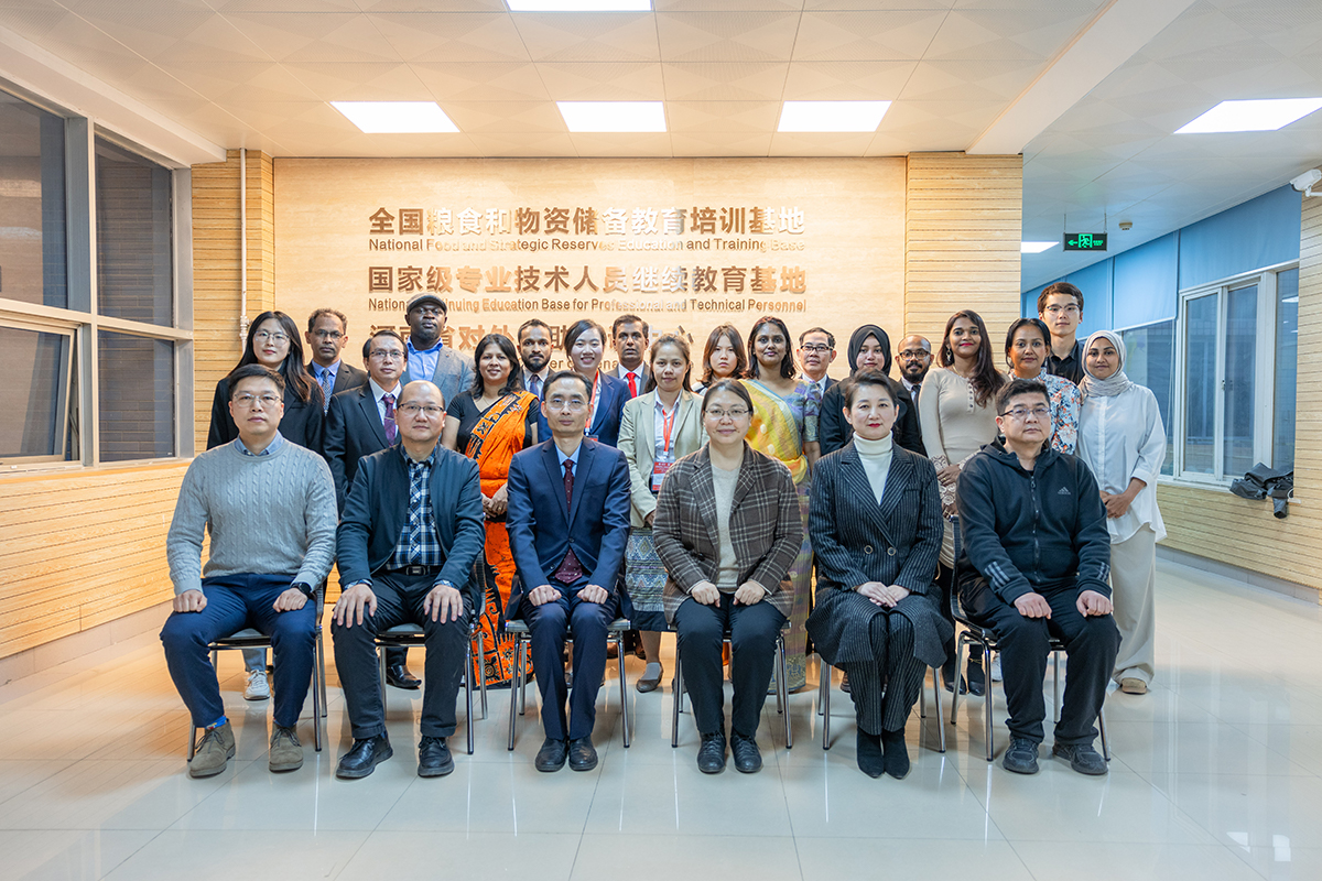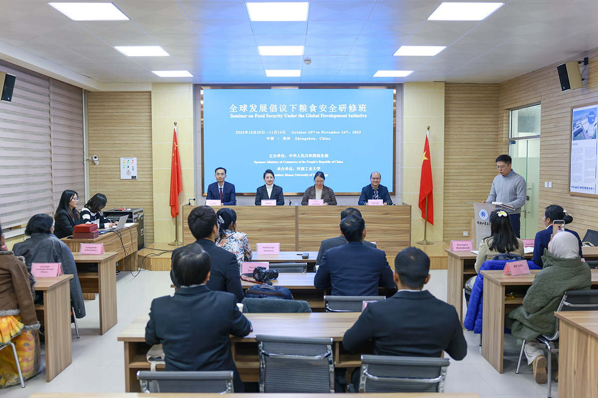 10月25日,河南工業大學國際交流與合作處處長張莉、河南工業大學糧食和物資儲備學院副院長閻磊、教育培訓學院院長劉克非、副院長沈貞以及來自發展中國家的16名學員共同出席了開班儀式。