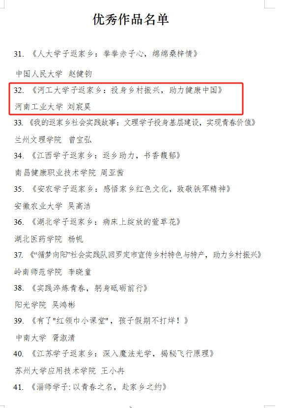 近日,由團中央青年發展部、中國青年報、中國青年網共同舉辦的2023年“我的返家鄉實踐故事”征集活動結果揭曉。經過報名審核、作品發布、網絡展示、綜合評審等環節,我校作品《河工大學子返家鄉:投身鄉村振興,助力健康中國》榮獲優秀作品,全國僅50個。