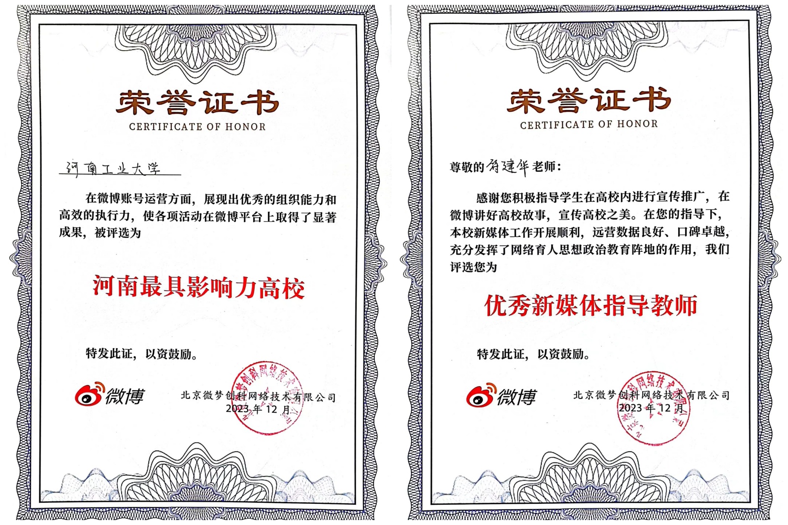 12月2日,2023年微博校園河南渠道高校新媒體交流會在河南農業大學龍子湖校區舉行。會上官方頒布了2023年度“微博校園河南最具影響力高校”和“微博校園河南優秀新媒體指導教師”等獎項。河南工業大學官方微博榮獲2023年度“微博校園河南最具影響力高校”,符建華榮獲2023年度“微博校園河南優秀新媒體指導教師”。