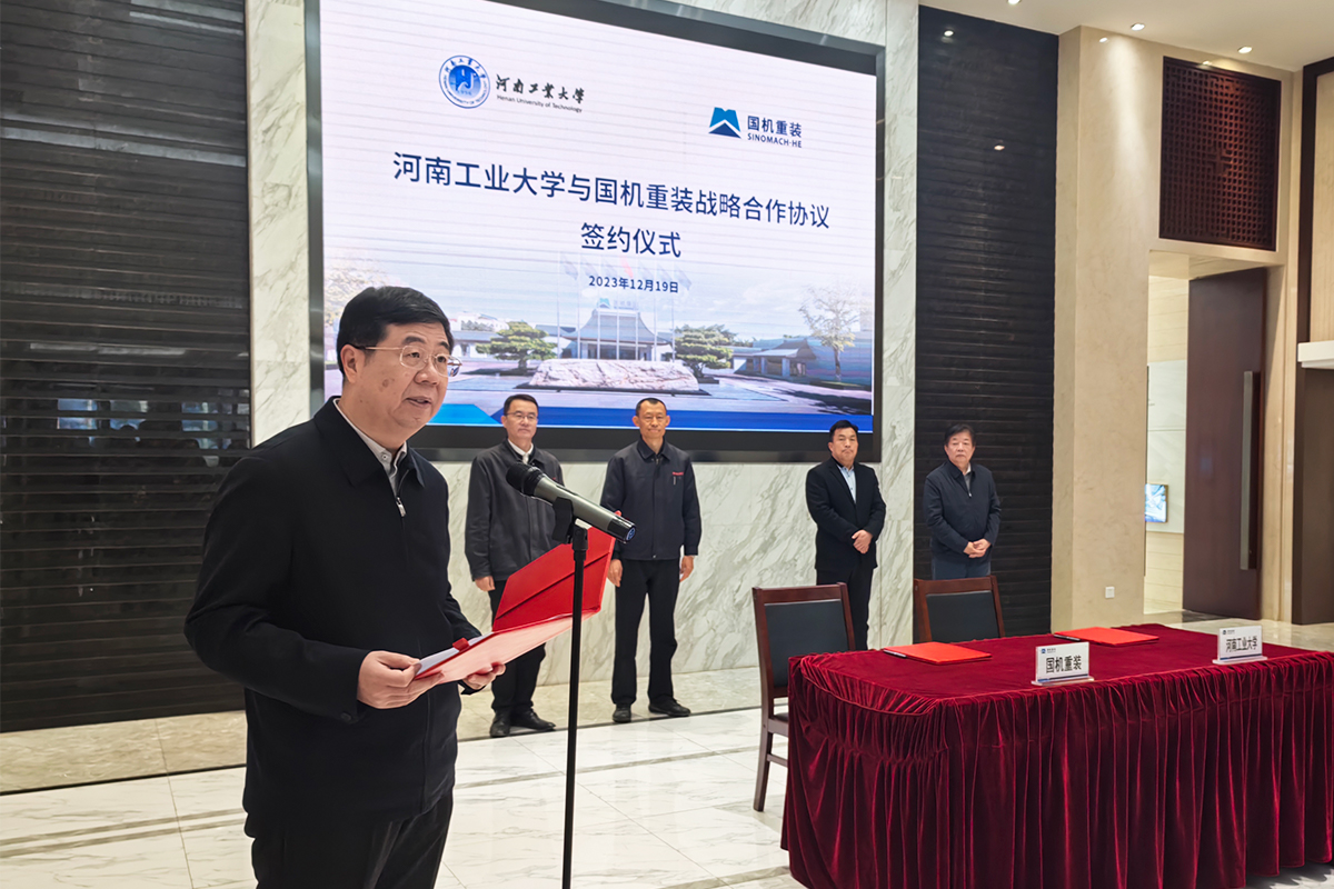 劉志軍代表河南工業(yè)大學致辭。他指出,糧食安全是“國之大者”,糧食機械是全方位夯實國家糧食安全根基、加快建設(shè)農(nóng)業(yè)強國的重要支撐;習近平總書記高度重視裝備制造業(yè)發(fā)展,強調(diào)裝備制造業(yè)是國之重器,要加強原創(chuàng)性、引領(lǐng)性科技攻關(guān),把裝備制造牢牢抓在自己手里,為我們工作指明了方向,提供了根本遵循;河南工業(yè)大學作為一所在糧食產(chǎn)后具有鮮明辦學特色的高校,在糧食機械方面,不僅擁有機械工程博士點和博士后流動站,而且擁有一支素質(zhì)過硬的師資隊伍;學校始終聚焦糧食機械設(shè)計理論及技術(shù)、數(shù)字化設(shè)計與制造等特色方向,以解決機械工程學科重大理論和工程問題為目標,著力服務(wù)糧食機械裝備的高質(zhì)量發(fā)展;國機重型裝備集團股份有限公司是世界500強企業(yè),是國家重大技術(shù)裝備制造基地,業(yè)務(wù)覆蓋極限制造領(lǐng)域全產(chǎn)業(yè)鏈,柔性制造優(yōu)勢突出,在國民經(jīng)濟建設(shè)中發(fā)揮著戰(zhàn)略性、基礎(chǔ)性的重要作用;雙方將以共同推進糧食機械裝備高質(zhì)量發(fā)展和糧機裝備產(chǎn)業(yè)轉(zhuǎn)型升級、加快實現(xiàn)高水平科技自立自強為合作宗旨,充分發(fā)揮高水平研究型大學與科技領(lǐng)軍企業(yè)特色優(yōu)勢,通過科技合作、人才培養(yǎng)、智力合作等方式,實現(xiàn)合作共贏,共同提升具有自主知識產(chǎn)權(quán)的糧機裝備核心競爭力,為扛穩(wěn)扛牢國家糧食安全重任貢獻雙方智慧和力量。