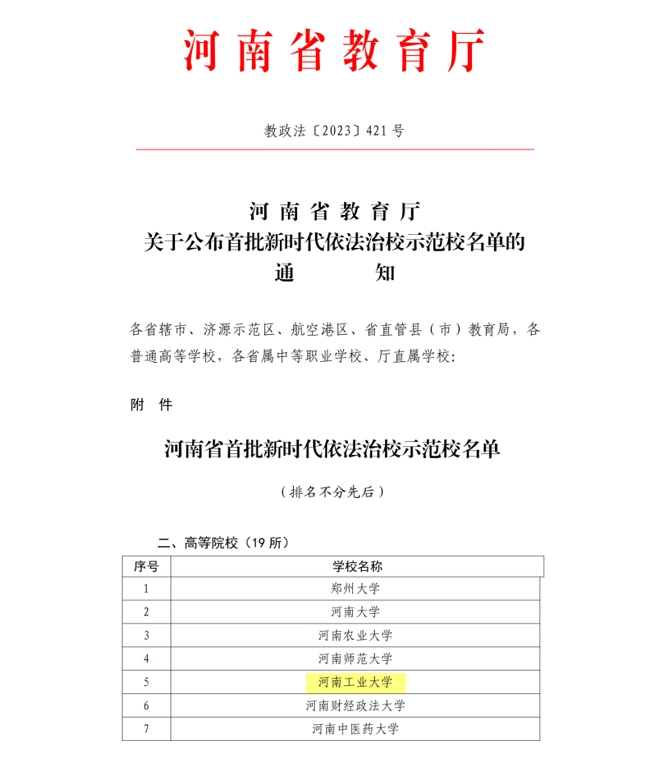 近日,省教育廳下發《關于公布首批新時代依法治校示范校名單的通知》(教政法〔2023〕421號),我校成功獲評“河南省首批新時代依法治校示范?!?。