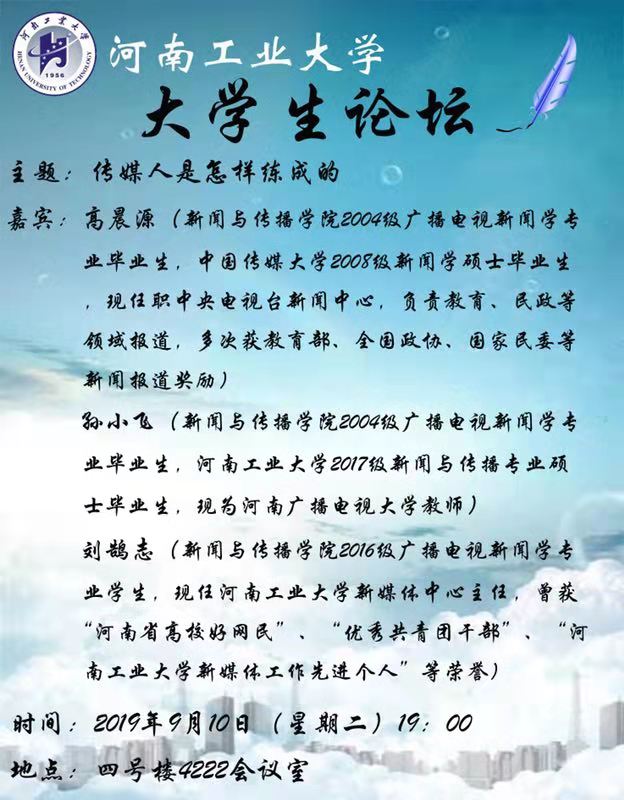 孫小飛,男,新聞與傳播學院2004級廣播電視新聞學專業畢業生,河南工業大學2017級新聞與傳播專業碩士畢業生,現為河南廣播電視大學教師。