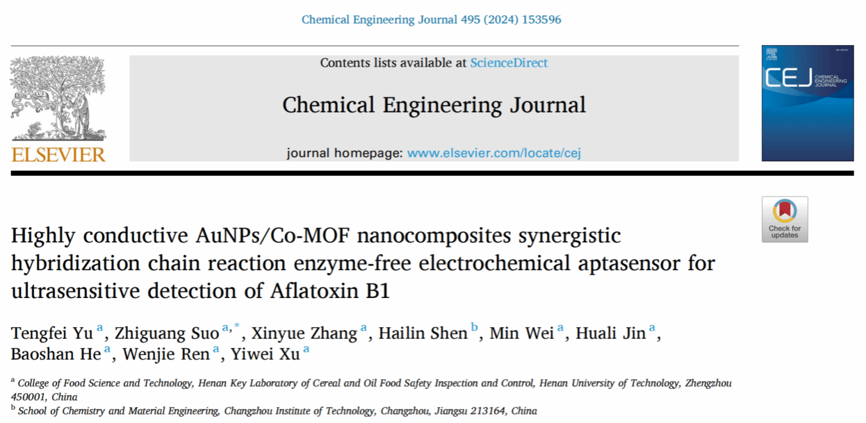 近日,我校糧油食品學院的現代營養食品創制及安全檢測團隊索志光博士報道了基于無酶擴增和AuNPs/Co-MOF電化學適配體傳感器用于黃曲霉毒素B1的檢測的最新研究成果。該成果發表在工程技術類TOP期刊Chemical Engineering Journal(影響因子:13.3),河南工業大學為第一完成單位和通訊單位,2022級碩士生余騰飛為第一作者,索志光博士為唯一通訊作者。