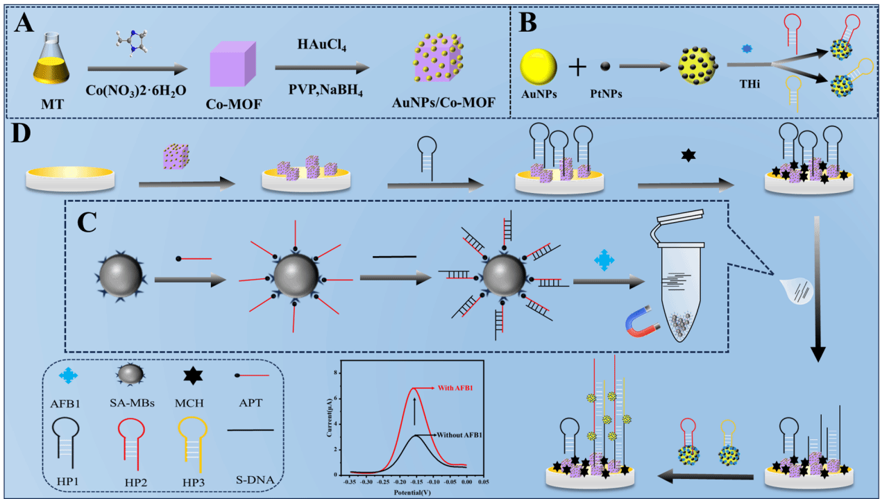 糧食谷物是中國的主要食品,然而這類食品在加工或者儲藏過程中很容易受到真菌毒素的污染。真菌毒素的種類有400多種,在眾多真菌毒素中,黃曲霉毒素B1 (Aflatoxin B1,AFB1) 是毒性最高的致癌物之一,AFB1的毒性是氰化物10倍、砒霜68倍,已被國際癌癥研究機構(IARC)歸為Ⅰ類致癌物。因此,迫切需要開發靈敏、有效的方法來分析污染樣品中的AFB1。本文以金納米粒子/鈷基金屬有機骨架(AuNPs/Co-MOF)為修飾材料,THi/Au@PtNPs作為信號探針,結合無酶信號放大策略,構建了一種檢測AFB1的電化學適配體傳感器。AuNPs/Co-MOF具有較大的比表面積和出色的導電性,可負載大量DNA鏈并增強硫堇(THi)氧化還原信號,從而顯著提高信號響應。Au@PtNPs對THi具有很高的催化活性,同時提高了負載THi的效率,使THi的電化學信號得以放大。此外,無酶雜交鏈反應(HCR)信號放大策略在確保傳感器穩定性的同時,還能引起強烈的電化學信號響應。