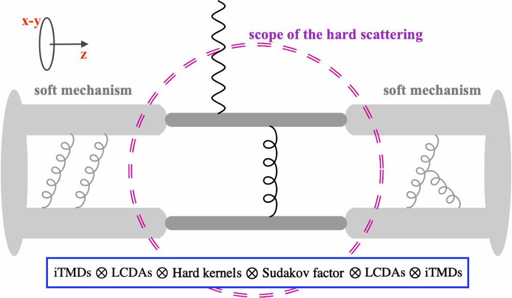 作為理解強相互作用的理想探針,輕贗標量介子形狀因子的研究伴隨著量子色動力學理論(QCD)的建立與發展。對于大動量轉移的遍舉QCD過程,因子化定理實現了將完整振幅寫成硬散射函數和光錐分布振幅(LCDAs)的卷積,前者可以通過微擾理論逐階計算,后者則定義了非微擾標度上輕強子內部價夸克動量的共線分布。在具體計算中,因子化公式中的重整化能標一般選定在因子化能標上,這使得LCDAs中軟的橫向動力學往往被人為截斷。