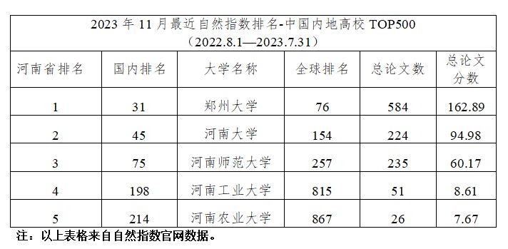 近日,自然指數(shù)(Nature Index)官網(wǎng)更新了最新的一期自然指數(shù)排名,統(tǒng)計時間節(jié)點為2022年8月1日至2023年7月31日,我校排名居河南省高校第4位,國內(nèi)198位,全球815位。與上一年相比(統(tǒng)計時間節(jié)點為2021年8月1日至2022年7月31日),我校省內(nèi)排名從第17位上升到第4位,提升了13位;國內(nèi)排名從342位上升到198位,提升了144位;全球排名從1623位上升到815位,提升了808位;論文總分?jǐn)?shù)從1.31上升到8.61,提升了7.3。各項指標(biāo)較上年同期有了大幅度提升,標(biāo)志著我校在學(xué)科基礎(chǔ)研究領(lǐng)域取得了突破性進(jìn)展。