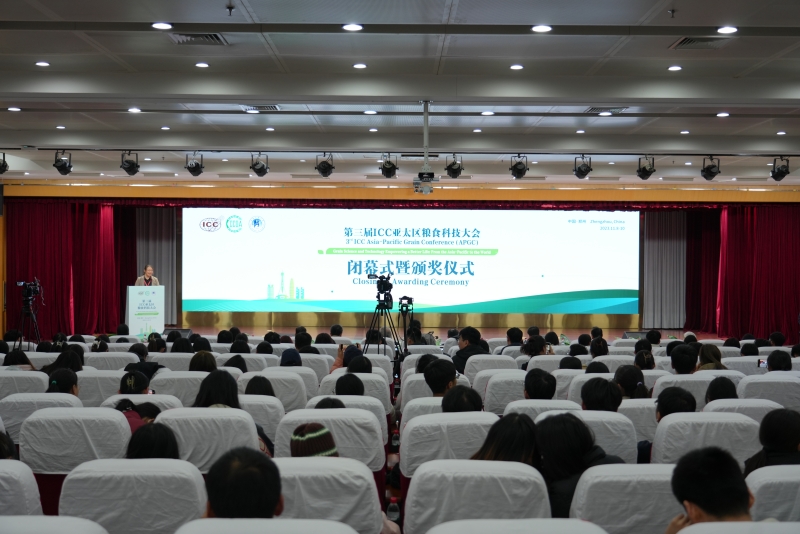 11月10日,大會舉行閉幕式。中國糧油學會理事長盧景波,小麥和玉米深加工國家工程研究中心主任、中國糧油學會副理事長李成偉,國際谷物科技協會(ICC)主席Gerhard Schleining,我校黨委書記劉志軍,國際谷物科技協會(ICC)國家會員代表、河南工業大學教授卞科,中國糧油學會副理事長兼秘書長張成志,國際谷物科技協會(ICC)秘書長Veronica Haslinger等領導和學者出席大會閉幕式,并為大會各項榮譽獲獎單位和人員頒獎。