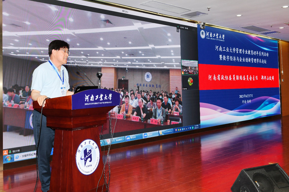 四十五載風雨路,不忘初心鑄輝煌。6月17日,由管理學院主辦的河南工業大學管理專業教育45年系列活動暨數字經濟與企業創新管理學術論壇在學術報告中心D205成功召開,本次論壇采取線上線下相結合的方式舉行。河南省政協委員聯絡委員會主任鄭邦山,河南財經政法大學黨委書記、校長司林勝,河南工業大學副校長陳桂香,中國社會科學院、南開大學、哈爾濱工業大學、首都經濟貿易大學、西安理工大學、中央財經大學、北京師范大學等高校與科研院所的專家學者,國內部分優秀期刊社負責人,鄭州大學、河南大學、河南科技大學、河南理工大學、華北水利水電大學、河南財經政法大學、鄭州輕工業大學、鄭州航空工業管理學院等省內高校兄弟學院領導,管理學院歷任老領導、校友代表、師生員工代表等參加活動。論壇開幕式由管理學院黨委書記魏明俠主持。