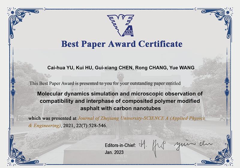 近日,由土木工程學院(建筑學院)2019級土木工程專業碩士研究生俞才華、2017級道路橋梁與渡河專業本科生王悅發表的學術論文“Molecular dynamics simulation and microscopic observation of compatibility and interphase of composited polymer modified asphalt with carbon nanotubes”(DOI:10.1631/jzus.A2000359)獲得由浙江大學主辦的Journal of Zhejiang University-SCIENCE A: Applied Physics and Engineering(JCR Q2,IF=2.485)學術期刊最佳論文獎。該獎項綜合考慮原創性、科學重要性、研究方法和影響力指標,從2020-2022年期刊發表論文中評審選出共10篇論文獲此榮譽。