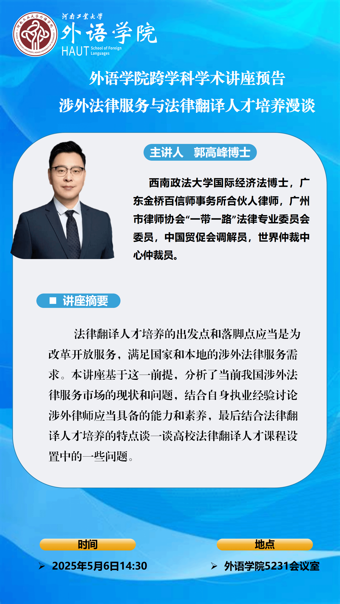 外語學(xué)院跨學(xué)科學(xué)術(shù)講座預(yù)告:涉外法律服務(wù)與法律翻譯人才培養(yǎng)漫談